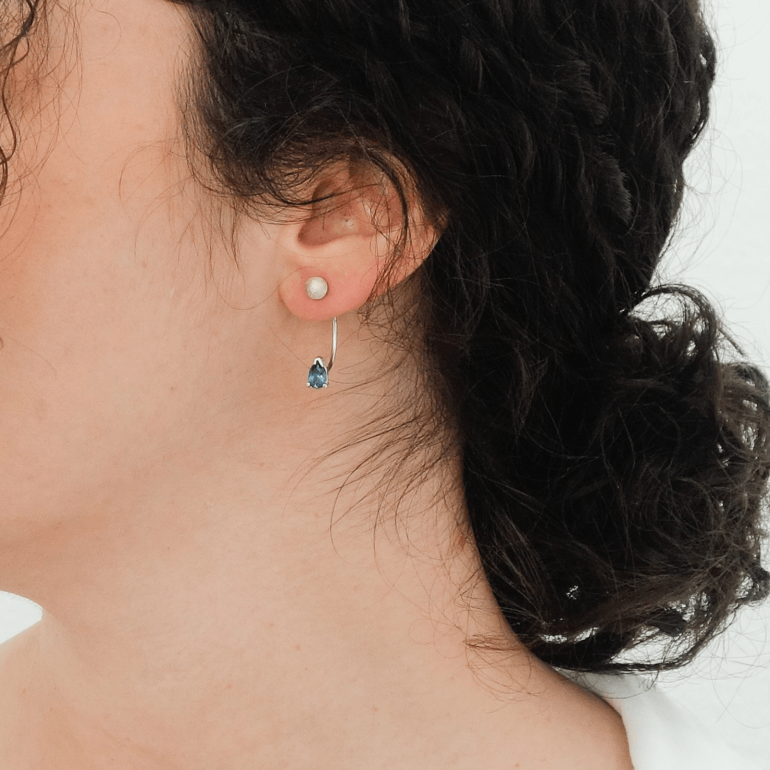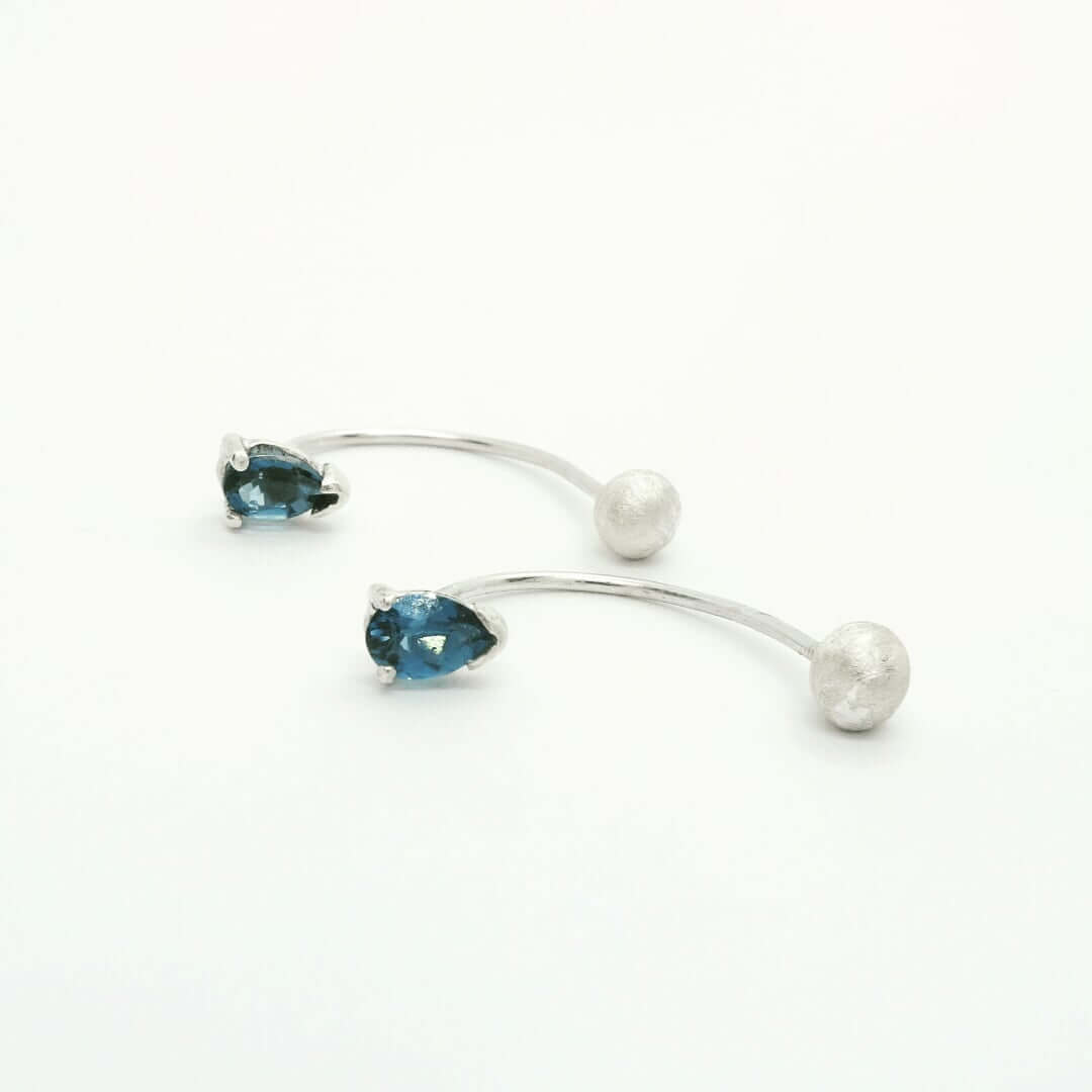 Sterling silver earrings with dark blue Topaz are inserted into the ear from the back and closed with screws.