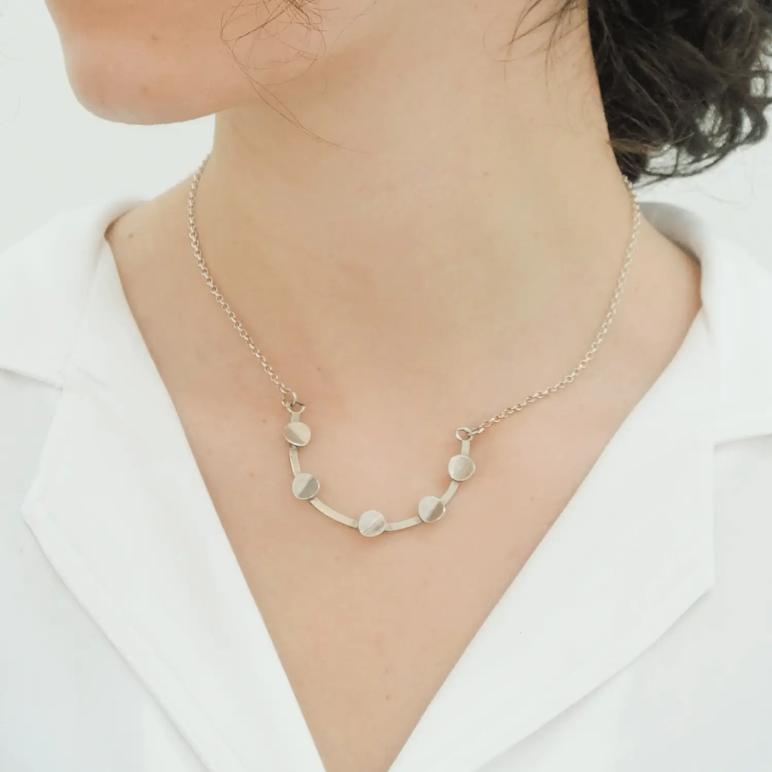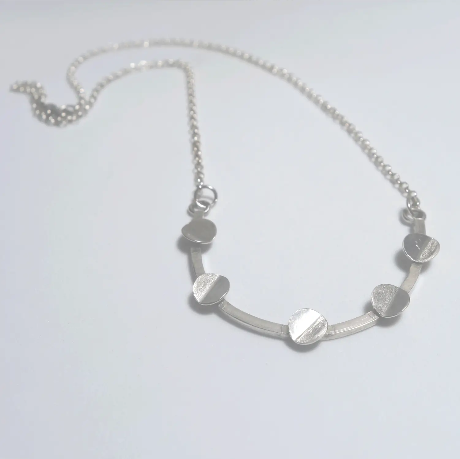Sterling silver necklace with round, and bent clean and satin surfaces that mirror the light.