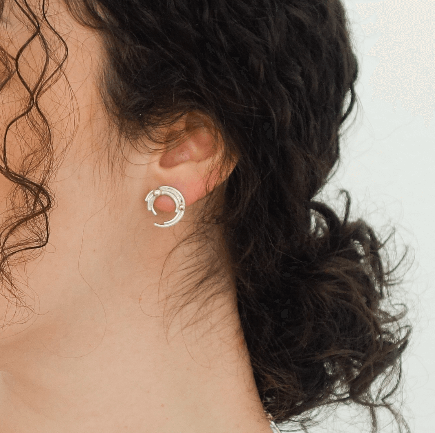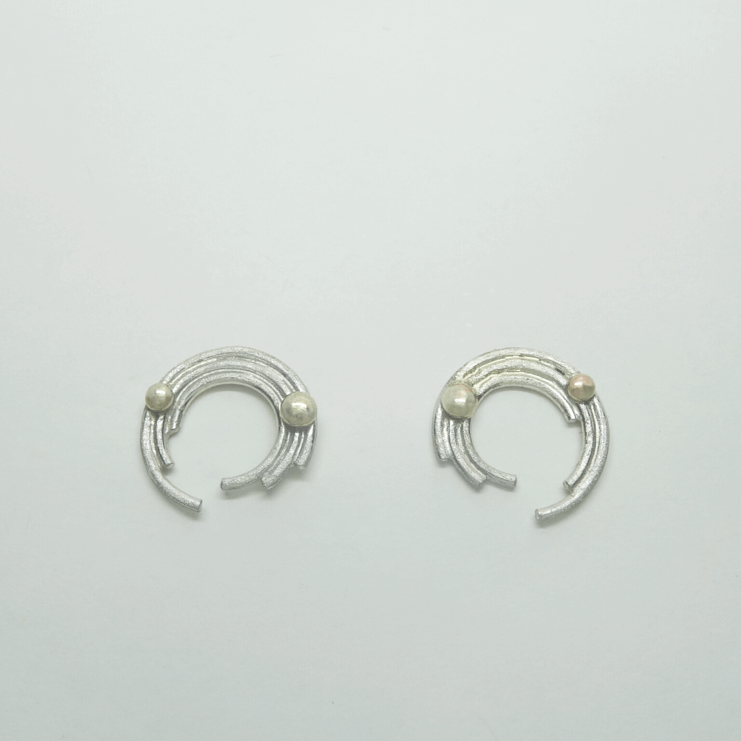 Round sterling silver earrings with two gold granules that represent two planets in their orbits around the Sun.
